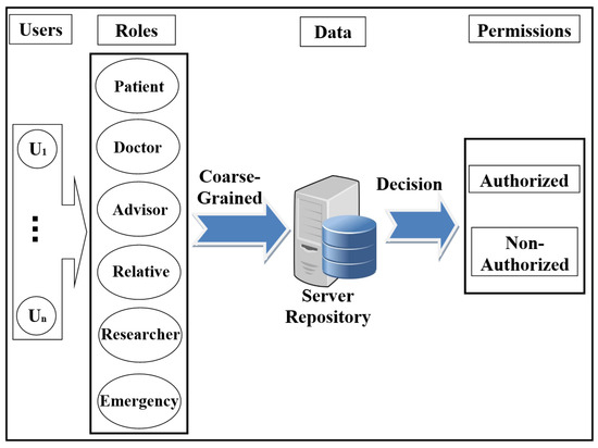Figure 1. Scheme of role-based access control (RBAC) model.In recent years, there has been significant interest in using the attribute-based access control (ABAC) model for the protection of data privacy. This model is designed to access data more accurately (fine-grained) and securely. It handles user attributes (such as name, address, age, mobile, location, time) to allow users to access the server’s repository. ABAC proposed to go beyond the limitations in the rules and design of the most well-known control access models (DAC, MAC, and RBAC) [22,23]. ABAC is a rich model because it deals with a wide range of user attributes. ABAC supports administration, authorisation of context-aware, risk-intelligence, and scalability in various applications such as the Internet, IoT, Big Data, cloud computing, and VANET [24]. The attributes in ABAC are categorized into subject, object, action, and environment. As shown in Figure 2, each user has a set of attributes that allows him/her to access data in the server.