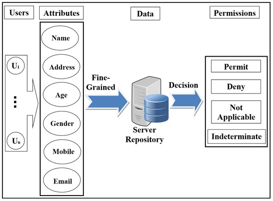 Figure 2. Scheme of attribute-based access control (ABAC) model. - Distributed AC implementation technologyThe most important component in the proposed EHR system is the EHR repository. The repositories contain data in various forms because these systems have difficulties dealing with different coordinates for data. Therefore, the use of extensible access control (XML) is suitable for the exchange of various data via the Internet. XML is a symbolic language and uses a simple and flexible method designed to describe, exchange, and manage data across the Internet.However, XML should support security and privacy mechanisms that provide different levels of protection of sensitive data in the whole or part of the XML document [17]. Access to data is a major challenge in big data management systems (EHR) that use different techniques. In addition, the exchange of information over the Internet has become essential and needs to achieve access authorisation, particularly in healthcare applications. Extensible access control markup language (XACML) standards include both access control (authorisation) and data management based on XML in the different systems [25]. Effectively, XACML offers features for data access and authorisation for the users at the fine-grained level, which is the most flexible and effective [26,27,28]. This technology is presented by the organization for the advancement of structured information standards (OASIS). This standard has many of the features that qualify it for use on the Internet, such as combining policy, combining algorithm, attribute, multiple subjects, policy distribution, implementation independency and obligations [23,28,29].This technique is based on the specific policies first and then on many modules such as policy enforcement point (PEP), policy decision point (PDP), policy administration point (PAP), policy information point (PIP), and policy retrieval point (PRP) to evaluate the request for access [4], as shown in Figure 3 (PEP sends and receives requests and accesses responses to the repository; PDP evaluates the decision; PAP creates policies based on users’ attributes; PIP retrieves users’ attributes; and PRP retrieves the users’ data from the repository). The result of the decision (permit, deny, not applicable, indeterminate) is sent to the subject via PEP [23].