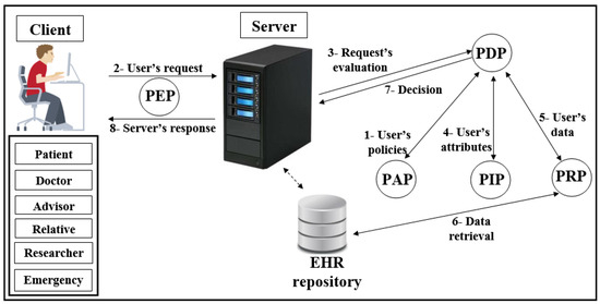 The security of medical records in the electronic health record (EHR) system has been a major focus of health and academic institutions, since the efficiency and quality of patients’ data management [1,3] by using the World Wide Web. EHR systems include identifications and patients’ data that require authorisation privileges to determine access control for authorised users [4]. Accurate medical data is essential for diagnosing diseases and determining the condition of patients during their online transfer from patient to healthcare provider [5,6]. Any change to this data causes health problems for patients. In addition, penetration of medical records of patients with diseases such as HIV infection or dermatological conditions can lead to discrimination, harassment, or even death of the patient if the diagnostic data changes during the transition from client to server [6,7]. In a broad sense, a terrorist may cause national instability by disclosing patients’ data, changing the data, destroying the data, or impersonating some patients [8]. Healthcare systems, and in particular, EHR systems, should provide end-to-end privacy for patients’ data. In addition, data storage and authorisation policies for patients in a central server yield data management gains but are an attractive target for hackers [8]. Therefore, there should be security mechanisms to protect the privacy of the patient as well as to prevent the penetration of policies on the server.