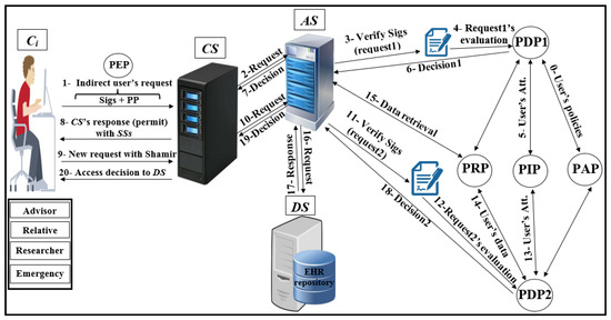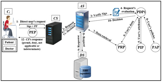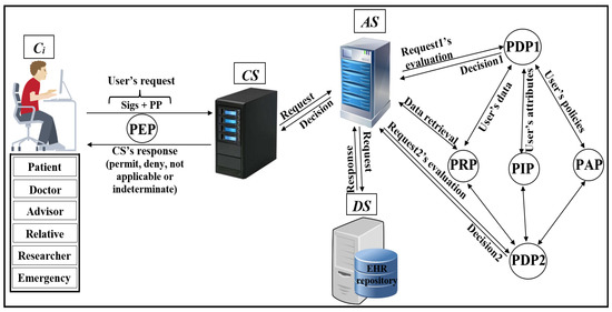 As shown in Figure 4, Pseudonymization and Anonymization with the XACML (PAX) is an authorisation system that works with EHR. The network model consists of four entities: client (), central server (), attributes server () and data server (). These entities communicate with each other in the PAX framework to accomplish authorisation and privacy preservation of users in access to the patients’ datasets. is the portal that prevents users from accessing directly to both and . Patients’ data are stored on the data server () and are fully separated from the attributes of the users (patients and healthcare providers) that stored on the attributes server (). Each creates an access request and sends it to the . Then, verifies the authorisation information for the user’s request, if this request is valid, sends the authorisation request to for an evaluation; otherwise, sends the “deny” response to . When receives the authorisation request from , evaluates the access request by PDPs modules, verifies signatures, pseudonyms, and other security parameters. If all evaluations and tests are valid, sends a request to to retrieve patient data; otherwise, sends the “deny” response to . After that, checks for signatures (Sigs) and privacy parameters (PP), if all operations are correctly performed, sends the required data with pseudonyms and Sigs to which in turn sends the “permit” response to by to allow access to the dataset. The authorised user will receive the “permit” response and the copy of the required data. The PAX system uses two PDPs (PDP1 and PDP2) to implement the user authorisation process, as shown in Figure 4. In this project, we focus on securing requests and policies to provide a high level of user privacy. PAX depends on the Balana Project, which is the only open source project that implements XACML v3.0 to ensure privacy and security for patients’ medical records.