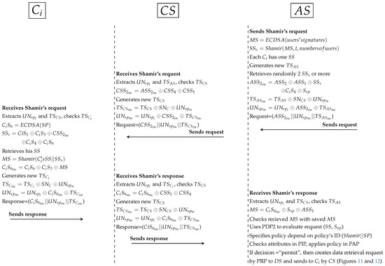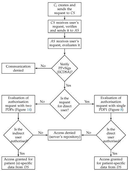 Figure 7. ’s request. - Using Shamir schemeIn PAX, we implemented the Shamir scheme to increase the level of security for indirect users (advisors, patients’ relatives, researchers, and emergency). Indirect users are legitimate users who can perform an internal attack because of the rights granted to them. PAX uses ECDSA to sign all signatures of healthcare users to create a master signature (MS). Then, PAX uses the Shamir scheme to generate secrets sharing () from a MS. Each indirect user receives via a secure communication channel. needs a set of to reproduce MS. PAX uses t = 3, which means that the randomly selected require at least 3 to generate . In addition, depending on , specifies that the user’s role is indirect and use the Shamir scheme with ECDSA’s Sig to verify the original and then evaluate the request by PDP2. Using Shamir’s scheme with XACML adds the property of authenticity, as an indirect user cannot access data with the same . This operation enables PAX to secure the privacy of patients’ data and protect patients’ data from internal and external attacks. When an indirect user wants access to medical records, he/she does not know whether the used to generate the belong to any specific healthcare providers.