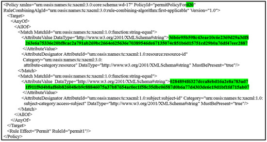 Figure 6. PAX policy. - Clients’ requests and server’s responsesPAX’s users must create an authorisation request to access medical records. This request consists of subjects’ and objects’ attributes. The application in PAX uses the parts of and as a single attribute to generate the ECDSA’s Sig for the subjects and the objects. Figure 7 shows the client’s request to access patient data (where the request parameters are highlighted in green; in resource segment represents the object’s attributes; and the in access-subject segment represents the subject’s attributes). In addition, the application uses a part of to explain to the the user’s role to determine the desired policy after verifying the Sigs. Then, the sends the request to the by for evaluation. The evaluates the request in the PDP engines, and the response (permit or deny) returns to the by .