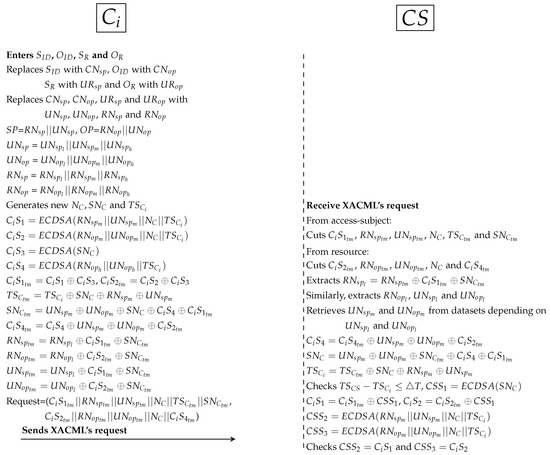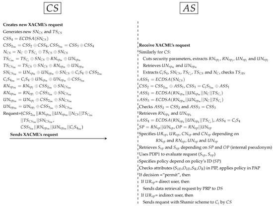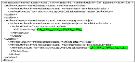 - generates random secret () and new timestamp () between and . Then, computes the secret signature () to protect . In addition, hides ’s parameters such as and to use them with validation operations in and . In addition, all Sigs (such as ) and PP (such as and ) are anonymously hidden by . At this point, sends XACML’s request to .