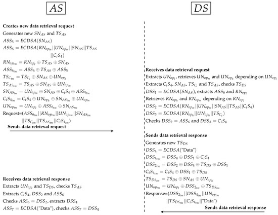 - receives the request, cuts Sigs and PP. After that, extracts original parameters (such as and ) and checks timestamp. computes (to extract ) and retrieves and depending on . Then, computes and to check and . If ’s parameters validated in correctly, computes timestamp () and signs patient’s data (). All Sigs (such as ) and PP (such as ) are anonymously hidden by . At this point, sends the response to .
