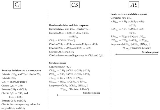 - Similarly, generates random secret () and timestamp () between and . computes to protect secret () between and . Additionally, computes to ensure legitimate PP ( and ) in . All Sigs (such as ) and PP (such as and ) are anonymously hidden by . Then, sends XACML’s request to .