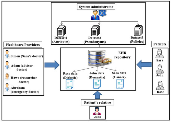 - Sun, J.; Zhu, X.; Zhang, C.; Fang, Y. HCPP: Cryptography based secure EHR system for patient privacy and emergency healthcare. In Proceedings of the 2011 31st International Conference on Distributed Computing Systems (ICDCS), Minneapolis, MN, USA, 20–24 June 2011; pp. 373–382. [Google Scholar]