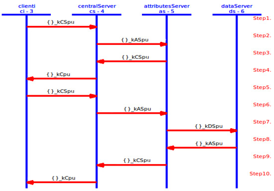 - Threat modelMany serious risks to healthcare systems that require the building of a threat model to detect weaknesses in these systems. Dolev-Yao threat model [19] is used to test users’ authorisation in PAX. It is a formal model, a practical way of analyzing authorisation protocols in real environments. This model is very efficient in examining and analyzing various attacks. We assume that attacks can be internal, external, active, and passive. Additionally, we suppose that attributes server () is trustworthy and safe against information repository penetration attacks. In this model, we address the following threats: