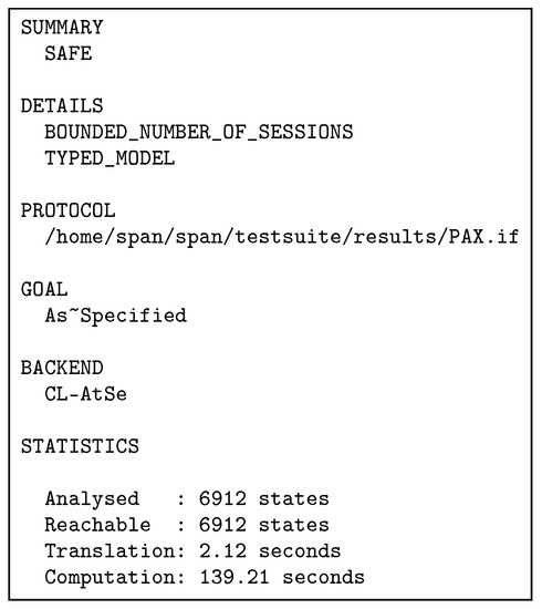 - Team, T.A. Avispa v1.1 User Manual. 2006. Available online: http://www.avispa-project.org (accessed on 10 September 2018).