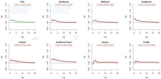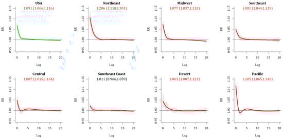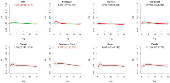 Extreme Cold Event (ECE) days are associated with a statistically significant increase in mortality across the US as a whole (Table 3 and Table 4), both on day 0 [RR: 1.029 (95% CI: 1.023, 1.035)] and in the 20-day cumulative period [RR: 1.201 (1.169, 1.233)], suggesting a greater than 20% increase in mortality risk. The lag-response structure shows an elevated risk on day 0 that increases and peaks 2–3 days after an ECE day, before retreating to being non-significant after around 15 days across the nation as a whole, and this pattern is broadly similar across each of the regions (Figure 2). The increase in mortality is most substantial across the southeastern US, particularly in the Southeast Coast region, where RR = 1.423 (1.348, 1.503) and the modeled lagged impact is significant out to 19 days. In separating impacts by month, the greatest 0-day impact is observed during the core ECE month of January [RR: 1.035 (1.029, 1.041)], although the greatest cumulative impact is observed at the start of winter, in December [RR: 1.351 (1.285, 1.419)] and decreasing through winter. This general seasonal pattern is observed across all regions except the Desert and Pacific, where the seasonal variations are much weaker, and is strongest within the Southeast and Southeast Coast regions.