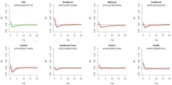 Relative Extreme Heat Events (REHE) show a statistically significant Day 0 response (RR = 1.018 (1.010, 1.025)], with the most substantive responses across the Pacific and Northeast, both of which were home to all statistically significant metropolitan areas. This Day 0 increase is nearly universally counteracted by a decrease in mortality on Days 1 and 2 (Figure 5), leaving no statistically significant increases in mortality in any metropolitan area or region when 20-day cumulative impacts are assessed.