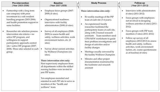 Within that context, this project component sought to improve the health and safety of nursing home workers by creating participatory teams of non-supervisory workers to address integrated workplace HP and OSH concerns within their own worksites []. The teams were started in three skilled nursing facilities in 2008 with the assistance of university researchers. The participatory program was compared with a corporate-initiated wellness program in three other facilities within the same company and geographical region. None of the six facilities had union representation of their workers. We sought to involve all employees, in various job titles and at different organizational levels. Evaluation of program fidelity, impact, and sustainability was based on data from all employees who answered the surveys. Figure 1 provides an outline of the study process and evaluation activities.