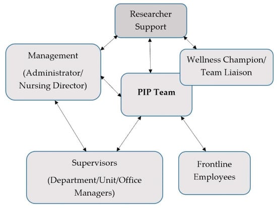 The intervention began with intensive orientation of the PIP team (2–4 meetings per site over 1–2 months) to worker health and well-being, and Total Worker Health as a comprehensive approach. PIP teams identified issues of importance to members and discussed possible solutions or projects to address these concerns. Team members sought the opinions of their co-workers for program goals and specific activities. PIP team members communicated with individuals at various levels of their facility with updates and available activities (Figure 2).