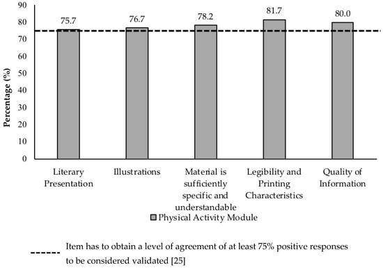 To obtain face validity of the module, the level of agreement of the expert panel members was calculated for the five evaluation aspects of the instrument (literacy presentation, illustrations, sufficiently specific and comprehensive material, legibility as well as printing characteristics and quality of information). According to Figure 1, the level of agreement among the experts was high, ranging from 75.6% to 86.7%, which was higher than the established minimum of 75% []. This indicates there is adequate face validity for the module. The experts also made suggestions to improve the module, both in its appearance and content, such as: changing the module title; replacing or excluding technical terms; reformulating illustrations; simplifying and restating phrases, among others.