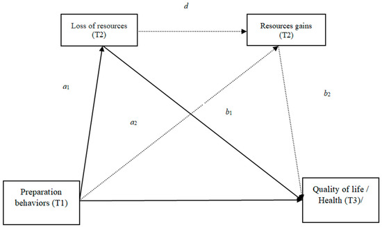 The relationship between retirement preparation behaviors (T1) and retirees’ quality of life (T3) will be significantly mediated by the loss of physical (h3a), cognitive (h3b), motivational (h3c), financial (h3d), social (h3e), and emotional resources (h3f), whereas gains in physical, cognitive, motivational, financial, social, and emotional resources will not be significant mediators.
