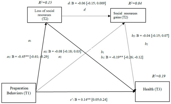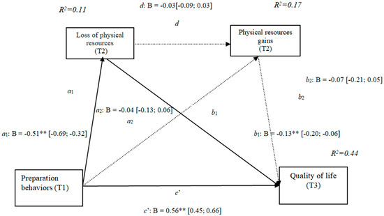 Comparison of the indirect effects of preparation behaviors (T1) through physical resource losses (T2) and gains (T2) in the prediction of quality of life (T3).