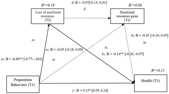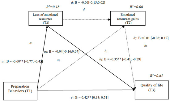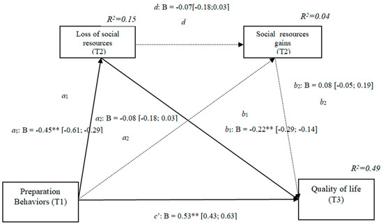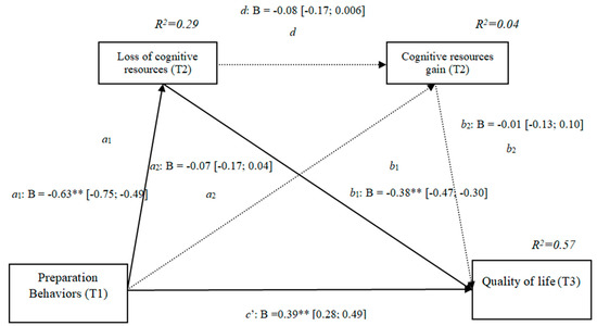 The results show that the only significant indirect effect was through cognitive losses, as it did not include the value 0 in the 95 % confidence intervals (preparation behaviors–cognitive losses–quality of life [0.15, 0.33]) (Table 3), whereas the indirect effects through the mediation of gains and of losses and gains concurrently were not significant. The results of the serial mediation account for a partial effect PM = 0.37 of the total effect. The comparison between the various effects the mediation of the loss of cognitive resources on the quality of life was significant, both separately and when subtracting the mediations of the gains (path c1) and of losses and gains conjointly (path c2). Therefore, these findings support Hypothesis 3b. In Figure 3, the non-standardized B coefficients, and the significance level, and confidence interval are specified. Comparisons between the indirect effects are presented in Table 3.