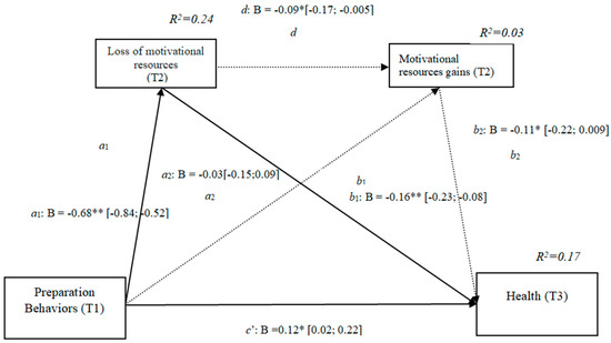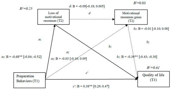 The results show that the only significant indirect effect was through motivational losses, as it did not include the value 0 in the 95%confidence intervals (preparation behaviors–motivational losses–quality of life [0.17, 0.34]) (Table 4), whereas the indirect effects through the mediation of gains and losses and gains concurrently were not significant. The results of the serial mediation account for a partial effect PM = 0.38 of the total effect. The comparison between the various effects the mediation of the loss of motivational resources on the quality of life was significant, both separately and when subtracting the mediations of gains (path c1) and of losses and gains conjointly (path c2). Therefore, these findings support Hypothesis 3c. In Figure 4, the non-standardized B coefficients, the significance level, and confidence interval are specified. Comparisons between the indirect effects are presented in Table 4.