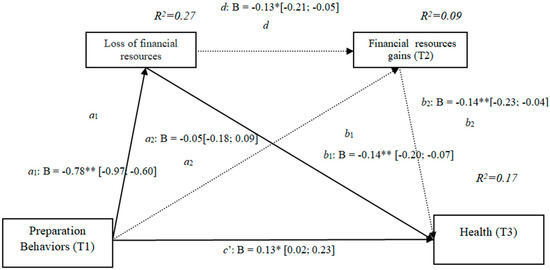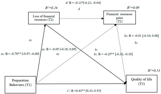 The results show that the only significant indirect effect was through financial losses, as it did not include the value 0 in the 95% confidence intervals (preparation behaviors–financial losses–quality of life [0.12, 0.29]), whereas the indirect effects through the mediation of gains and of losses and gains concurrently were not significant. The results of the serial mediation account for a partial effect PM = 0.30 of the total effect. The comparison between the various effects the mediation of the loss of financial resources on the quality of life was significant, both separately and when subtracting the mediation of gains (path c1) and of losses and gains conjointly (Path c2). Therefore, these findings support Hypothesis 3d. In Figure 5, the non-standardized B coefficients, the significance level, and confidence interval are shown. Comparisons between the indirect effects are presented in Table 5.