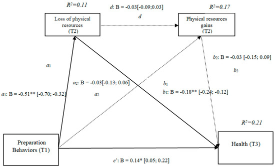 The results show that the only significant indirect effect was through physical losses, as it did not include the value 0 in the 95% confidence intervals (preparation behaviors–physical losses– quality of life [0.02, 0.19]) (Table 2), whereas the indirect effects through the mediation of gains and of conjoint losses and gains were not significant. The results of the serial mediation account for a partial effect PM = 0.11 of the total effect. The comparison between the various effects the mediation of the loss of physical resources on quality of life was significant, both separately and when subtracting the mediations of gains (path c1) and of losses and gains conjointly (path c2). Therefore, these findings support Hypothesis 3a. In Figure 2 the non-standardized B coefficients, the significance level, and confidence interval are specified. Comparisons between the indirect effects are presented in Table 2.
