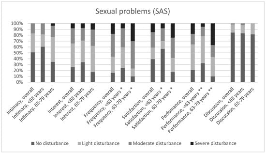 Experienced sexual problems. * Significant difference based on age at p < 0.01 level; ** significant difference based on age at p < 0.001 level. SAS, sexual adjustment scale.