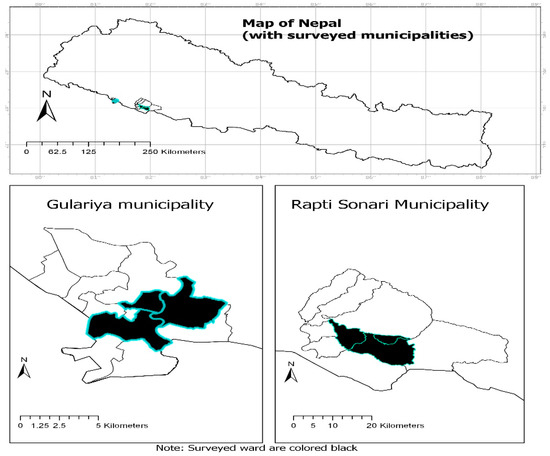 Three wards (5, 8 and 12) of the Gulariya municipality in the Bardiya district and three wards (3, 4 and 5) of the Rapti Sonari rural municipality in the Banke district (shaded areas in Figure 1) were selected purposively. From these purposively selected wards of each municipality, farming households were selected by using systematic random sampling. In total, 350 household heads or main family members were interviewed. Among these sampled households, 52% of interviewed households were from Rapti Sonari and the remaining 48% were from Guleriya. The survey was conducted from the first week of November 2017 to the third week of January 2018 by three experienced and trained research assistants who spoke Nepali, the main language used for the survey, and who could also understand Tharu and local dialects. Ethics approval to conduct this reseach was obtained by the Charles Darwin University Human Research Ethics Committee (H17110).
