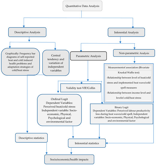 A bivariate relationship was analysed using a Kruskal–Wallis test to examine the relationship between heat and cold-related responses and other explanatory variables, such as the level of household income and the level of heat and cold stress. Multicollinearity was tested for using the ‘Collin’ command in STATA. The mean variance inflation factor (VIF) was less than 10 (Mean VIF < 1.89), meaning that there was no indication of correlation [103]. The correlation among the included explanatory variables did not exceed 0.56, thus no correlation exists, as shown by correlation matrices (Tables S4–S7 in Supplementary Materials). For details, see the following analytical framework (Figure 2).