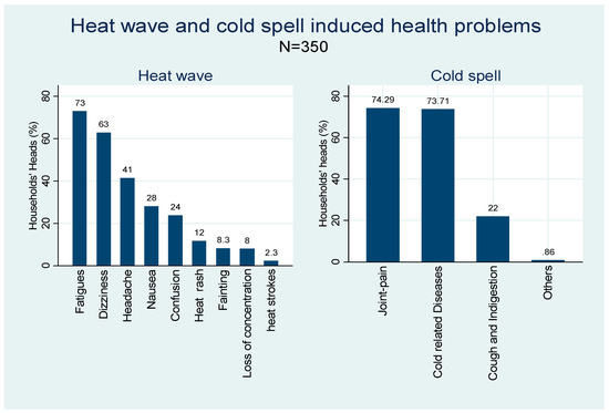 The most common heat wave related health problems among Nepalese farmers are fatigue, dizziness and headaches, followed by nausea, fainting, confusion and heat rashes. These results confirm findings in other studies from Nepal [55], India [14,35] and other parts of the world [13,72,106]. The most common symptoms during cold spells are joint pain (arthritis), cold-related diseases (such as respiratory problem, pneumonia, cold cough) and indigestion problems, as was also reported by Hassi, Rytkönen, Kotaniemi and Rintamäki [74], and Davídkovová et al. [107].