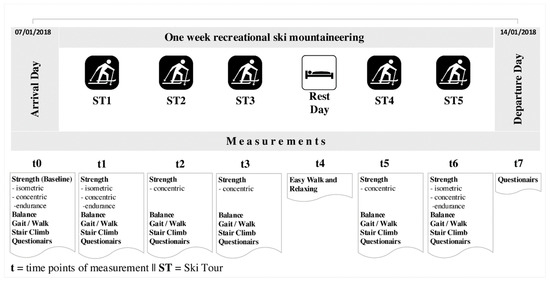 An overview of the measurement times and coding is given in Figure 1. Concentric maximum strength of the muscles of interest, static balance, and functional abilities were assessed at t0, t1, t2, t3, t5, t6 (t0…t6 = timepoints of measurement). In addition, isometric strength and concentric strength-endurance of the extensor and flexor muscles of the thigh muscles were measured at t0, t1 and t6. With regard to mental health, the Feeling Scale and the Felt Arousal Scale were completed before and after each ski tour (t1, t2, t3, t5, t6). The Mood-Scale, Recovery-Stress Questionnaire (REST-Q) Sport and Short-form (SF)-12 questionnaires were completed at t0 and t7. No assessments were performed on the rest day. For each ski tour, the duration, distance and altitude were recorded. Before each ski tour, a visual analogue scale was used to determine the current state of health (−5 = very bad, 0 = neutral, +5 = very good) in order to avoid participation of those with acute health issues (t1, t2, t3, t5, t6). Post-exercise, participants filled in the Borg Scale. (t1, t2, t3, t5, t6). There were two subjects at the same time for testing, and the time difference between pairs was 15 minutes. The sequence of examinations was as follows: questionnaires–balance–gait–stair climb test–strength. Strength and functional abilities were tested between a minimum of 1 and a maximum of 3 hours post exercise, including a 20-minute warm up on the cycle ergometer.