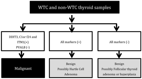 While diagnosis of papillary thyroid carcinoma (PTC), the most common subtype, can usually be achieved through cytology, diagnosis of other thyroid cancer histologies can prove to be more difficult [13], resulting in benign thyroid lesions being incorrectly classified as malignant. We have previously developed a panel of molecular markers to distinguish benign from malignant thyroid cancer, which can be used to cost-effectively identify the presence of over-diagnosis [14,15,16]. As seen in Figure 1, the panel of molecular markers includes DDIT3, ITM1, C1orf24, and PVALB antibodies, the utility of which has been described elsewhere [14,15,16], which can accurately discriminate between malignant and benign tumors with a sensitivity and specificity close to 100% (Figure 1).
