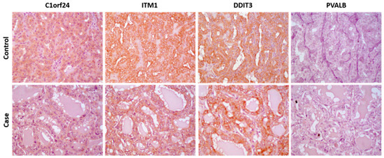 Except for three thyroid samples, all thyroid tumor tissue samples from thyroid tissue from the two groups and all histology types tested positive for malignancy with antibodies C1orf24, ITM1, and DDIT3 and negative PVALB (Supplementary Table S1). For the other three samples (two WTC cases and one control), it was not possible to detect actual tumor tissue in the slides used for immunohistochemistry, and therefore, these samples could not be confirmed as malignant in the antibody-based test; all three samples were taken from tumors originally less than 0.3 cm in size. Most of the tumors had a strong brown staining for three markers (DDIT3, ITM1, and C1orf24) and no staining for the benign Hurthle adenoma marker (PVALB) (Figure 2; Supplementary Table S1).