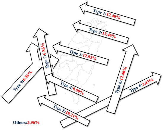 Types of typhoon paths and the percentage of occurrence (1911–2017) [29].
