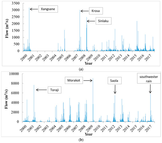 Figure 3 shows the daily streamflow during 2000–2017 at the downstream gauging stations of each river basin. The highest maximum daily streamflow during the period were identified with the corresponding typhoons, which are mostly path types 2 (typhoons Krosa, Sinlaku, Saola), 3 (typhoons Toraji, Morakot, Megi, Sepat), 5 (typhoon Usagi), and 6 (typhoons Xangsane, Mindulle) typhoons. Furthermore, a list of cumulated daily discharge and maximum sediment concentration during indentical typhoon events of 2000–2017 is shown in Table 4.
