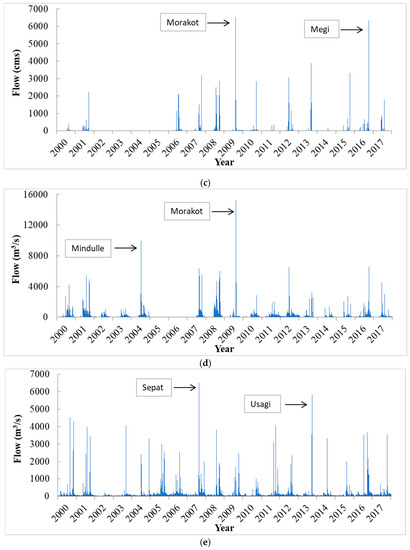 Historical daily streamflow of downstream gauging stations in the five river basins. (a) Tamshui River basin (STN_2); (b) Zhuoshui River Basin (STN_4); (c) Zengwen River Basin (STN_6); (d) Gaoping River Basin (STN_7); (e) Hualien River Basin (STN_9).