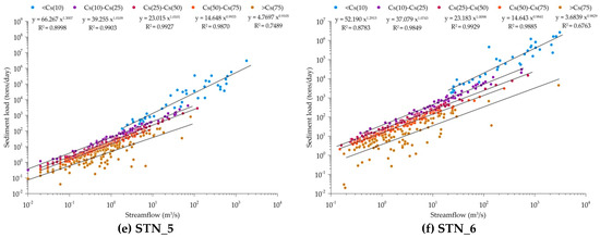 Many studies have indicated the significant relationship between sediment and water discharge [9,10,11]. Especially, the typical steep hillslopes found in Taiwan result in high streamflow speed, and thus the sediment exports brought by heavy rainfalls can be significant. Studies have indicated that the channel morphology changed rapidly in Taiwan, and thus the sediment rating curves need to be updated for every year [42,43]. In order to further investigate the relationship between sediment load and discharge at different levels of sediment concentration, we applied the FDC to categorize the data into five groups by using different thresholds of sediment concentration. The values of Cs(10), Cs(25), Cs(50), and Cs(75) indicate the sediment concentration threshold that 10%, 25%, 50%, and 75% of the observed sediment concentration data was equal to or exceeded it, respectively. The statistical analysis of the relationship between sediment load and discharge of various exceedance groups is shown in Figure 4. In the figure, we investigated effect of sediment concentration level on the power of the relationship between the sediment load and discharge. It is found that the grouped relationships are generally better than the overall relationship. For example, the R2 values of the grouped relationship at STN_2 and STN_7 are all greater than 0.8, while the R2 values of the overall relationships are less than 0.7. This finding shows that different erodible materials could be identified by the sediment concentration, and thus a more significant relationship between sediment load and discharge could be defined.
