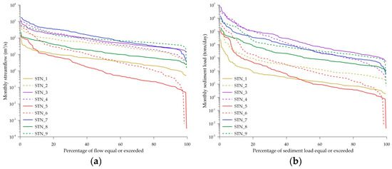 Generally, the trend of sediment duration curves follow the flow duration curves (Figure 5). Thus, the sediment duration curve of the Tamshui River basin is the flattest, followed by that of basins in eastern and southwestern Taiwan. The Sed10 at the Zhuoshui River basin (348,324.65 ton/day and 409,247.80 for STN_3 and STN_4, respectively) and at the downstream of the Hualien River basin (207,677.94 ton/day for STN_9) are much greater than other stations. The large differences in Q10 and Q75 discharge (215.86 m3/s–388.1 m3/s) at STN_3, 4 and 9 resulted in differences in Sed10 and Sed75 ranging between 205686.04 ton/day and 408,230.62 ton/day. The results showed that an extremely large amount of sediment load should be expected when the monthly discharge exceeds the Q10 threshold.