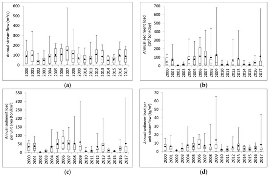 Figure 6 shows the temporal variation in annual streamflow, annual sediment load, unit-area sediment load and unit-discharge sediment load in the five river basins from 2000 to 2017. The length of the box represents the variation of streamflow and sediment load in Taiwan of the specific year. Due to fewer typhoons during 2002–2003, 2010–2011 and 2014–2015, the annual streamflow was lower than other years (Figure 6a). Consequently, the annual sediment load, unit-area sediment load and unit-discharge sediment load (Figure 6b,d) were also low in those years. In contrast, the high values of streamflow and sediment load were found in years that had significant typhoon events. For example, the top three highest annual streamflows were found in 2001, 2007 and 2008 (Figure 6a), while the top three highest sediment loads and unit-area sediment loads (Figure 6b,c) were found in 2008, 2009 and 2017. For unit-discharge sediment load, the top three highest values were found in 2008, 2009 and 2017. The significant typhoon events that brought high values of streamflow or/and sediment loads include typhoon Toraji and Nari in 2000, Sepat and Krosa in 2007, Fungwong, Sinlaku and Jangmi in 2008, Morakot in 2009, Saola in 2012, Soulik and Usagi in 2013, and Haitang in 2017. The average unit-area sediment load in Taiwan during 2000–2017 ranged between 1.80 and 61.11 ton/km2 with the maximum value of 313.78 ton/km2 at STN_3 in the Zhuoshui River basin in 2017, while the average unit-discharge sediment load ranged between 0.99 and 13.58 kg/m3 with the maximum value of 60.26 kg/m3 at STN_3 in the Zhuoshui River basin in 2009 due to the invasion of typhoon Morakot during which heavy rainfalls brought abundant sediments. The time lag between the peak flow and peak sediment shown in Figure 6a,b may be linked with the occurrence of hysteresis effect, when the suspended sediment concentration values were different during the rising and falling limb for the same discharge [45]. Therefore, if the instant discharge and suspended sediment concentration were measured during the rising limb of water discharge, the resultant sediment load may be overestimated. In contrast, the sediment load may be underestimated if the sediment rating curve was constructed using the instant discharge and suspended sediment concentration measured during the falling limb.
