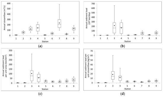 Many studies have indicated that discharge is the key factor affecting the amount of sediment load in the rivers [44]. In order to compare the characteristics of sediment transport in different watersheds, we first calculated the annual streamflow which is calculated as the average of the daily streamflow in a year, and the annual sediment load which is annual-averaged daily sediment load which is the average of daily sediment load in a year calculated as the daily measured streamflow multiplied by the daily sediment concentration estimated by the best fitted regression model (Table 6). Then, the annual unit-area sediment load is calculated by dividing the annual sediment loads at each gauging station by its drainage area, and also the annual unit-discharge sediment load by dividing the annual sediment loads by its annual discharge.