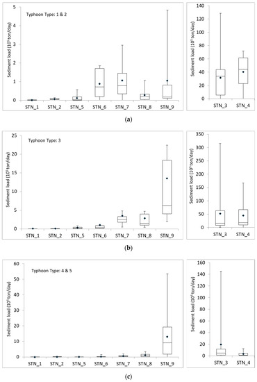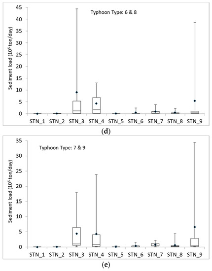 Typhoons of path Type 3, 4, and 5 invaded Taiwan from the east and two of the types (Type 3 and 4) landed Taiwan on the east coast. Therefore, the Hualien River basin (STN_9) located in eastern Taiwan had comparable sediment loads to those of the Zhuoshui River basin (STN_3 and STN_4) as shown in Figure 8b,c. However, the typhoon intensity was dampened when Type 3 typhoon events passed through Central Mountains to western Taiwan, and thus the sediment loads recorded at STN_3 and STN_4 during Type 3 typhoons were relatively low compared to those recorded during other events in the two stations (Figure 8b). Generally, the sediment loads in the river basins in western Taiwan were lower than those in eastern Taiwan during typhoons of Type 3, 4, and 5 (Figure 8b,c). For most of typhoon events, sediment loads in the Zhuoshui River basin (STN_3 and STN_4) were generally higher than other basins. However, the difference was smaller during the typhoon events of Type 6 & 8 and Type 7 & 9, which invaded Taiwan from the south towards northeast or northwest and usually did not land the island (Figure 8d,e).