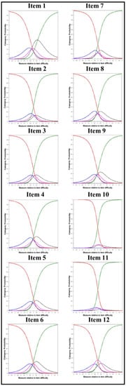 Item category curves (ICC) for the 12 items. All items showed disordered thresholds that suggested that the categories should be collapsed.