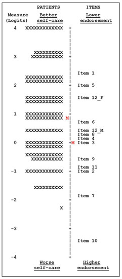 Map of items and persons. Each “X” represents 1 patient. Self-care and endorsement of items are measured in the same units. The “M’s” represents the mean level of self-care on the patients’ side and the endorsement location on the items’ side.