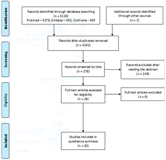 The flow diagram of study selection is shown in Figure 1 [,]. A total of 5110 studies were identified through the search in the referred databases, with one added from other sources and, after the removal of duplicates, there were 4232 studies. After sorting by title, 278 studies were obtained. There was a total of 29 studies articles sorted for eligibility after reading the abstract, with 249 being excluded. Reading the full text led to the exclusion of nine records when submitted to the scrutiny of the exclusion criteria. After reading the articles in full, 20 articles were included for the systematic review.