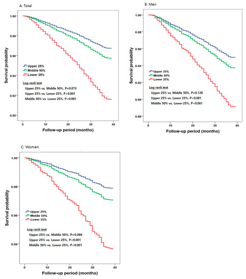 In women, the mortality rate per 1000 person-years was 0.6 for the lower eCRF group, 0.3 for the middle eCRF group, and 0.2 for the upper eCRF group. The Kaplan–Meier morality functions, as illustrated in Figure 1C, showed that the upper and middle eCRF groups had a significantly lower risk of all-cause mortality (p < 0.001 and p < 0.001, respectively) compared with the lower eCRF group, with no difference in all-cause mortality between the upper and middle eCRF groups (p = 0.066).