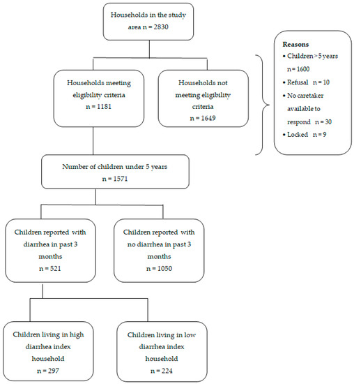 A total of 2830 households were approached and 1181 households, which had children below five years of age, were included in the study. From the 1181 households, 1571 children were included, with 815 boys and 756 girls. A total of 858 children belonged to rural areas, and 713 were from urban slums. The selection of study participants and their distribution according to low and high diarrheal index households is depicted in Figure 1. In the study area, 17 formal and 43 informal healthcare providers are present, which were often the first point of contact for healthcare-seeking for the community. Mothers were the main caregivers in the majority (99.6%) of households.