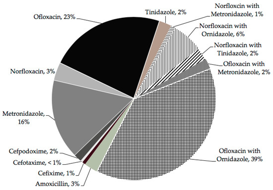 Out of the total 1571 children, 521(33%) children were reported to have acute diarrhea. Among the 521 children having diarrhea, a total of 510 (98%) children received some treatment (Table 3). The different antibiotics prescribed to children during the last episode of diarrhea are shown in Figure 3. The most common antibiotic prescribed was ofloxacin (n = 104; 23%), followed by metronidazole (n = 72; 16%), and the most commonly prescribed combination of antibiotics was ofloxacin with ornidazole (n = 175; 39%), followed by norfloxacin with ornidazole (n = 28; 6%). Overall antibiotic combinations were prescribed to 54% of children (n = 227). Among the children who received treatment (n = 423), 83% received antibiotics, 29% received ORS, and only 10% received zinc. Other drugs prescribed were probiotics (25%), paracetamol (18%), loperamide (16%), dicyclomine (7%), and ondansetron (5%). Figure 3 provides the details of the antibiotics given to children with diarrhea.