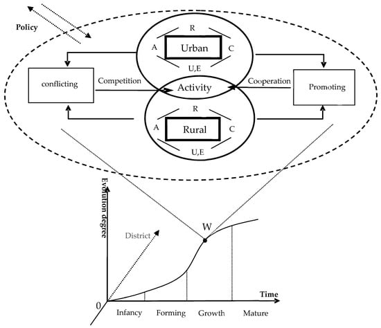 The development of an urban water resources system provides conditions for the improvement of rural water resources system (Figure 2). The development of the rural water resources system provides support for the development of the urban water resources system, forming mutual promotion between urban and rural systems. The two systems compete in terms of space and opportunity, and the over-development of water resources and the contradiction between urban and rural water resources are intertwined, resulting in the mutual suppression of the two systems. The co-evolution of the urban and rural systems refers to the structure and process formed in the interaction between different urban and rural elements in the long-term evolutionary interaction, driven by the inhibitory and promoting effects. From the perspective of biological evolution, the most basic coevolutionary mechanism of an ecosystem is competition and cooperation, which is also an important driving force for the evolution and development of urban and rural water resources systems. According to the synergetic theory and water poverty theory, the internal factors of urban and rural water poverty can be systematically divided into five units of resources, facilities, capabilities, use and environment, which constitute the symbiosis of the urban and rural complex system. Each symbiont and each element of the symbiont stimulate the overall vitality of the system through moderate competition and promote upgrading of the system. In addition, the reciprocity between the symbionts and their elements is conducive to the optimal allocation of resources and the expansion of each other’s development space. However, the vicious competition will compress each other’s development space, causing the system to be unable to achieve its ideal development condition. Under the joint action of the internal mechanism and external policy, the system will go through the dynamic evolution process from germination, formation, growth and maturity of the collaborative evolution between systems.