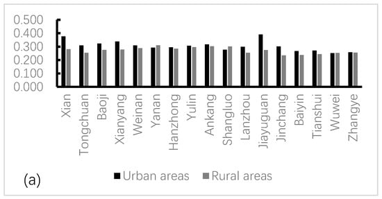 The estimation results show the actual urban and rural water poverty situation in northwest China from 2000 to 2017 (Table A13 and Figure 3). The results show that water poverty values vary widely from 0.118 to 0.443 in urban areas and from 0.146 to 0.352 in rural areas. The higher the score, the better the situation, the less water poverty. In Appendix A, the value change reveals the improvement degree between urban and rural water poverty and shows two main results: (i) the water poverty situation across northwest China is gradually improving, and (ii) the absolute difference in the improvement degree for urban and rural water poverty has gradually widened. These two results imply that the improvements in urban and rural water poverty have not been harmonious. The situation of water poverty in rural areas changes slowly, and the change in speed and degree is much lower than urban areas. This finding shows that urban areas, which are characterized by rapid economic growth, display accelerated improvement in water poverty.