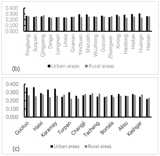 The urban and rural water poverty values (a,b,c) in northwest China.