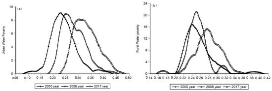 The kernel density distribution map of urban (a) and rural (b) water poverty in northwest China.