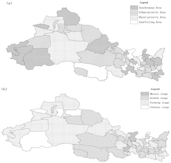 The symbiosis types (a) and stages (b) of urban and rural water poverty in northwest China.