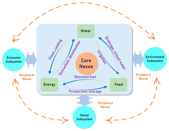 Water–energy–food (WEF) nexus. This figure includes the core and peripheral nexus of the WEF system. The core nexus refers to the relationship among the water, energy, and food subsystems. The peripheral nexus refers to the relationship between the core nexus and social, economic, and environment subsystems.